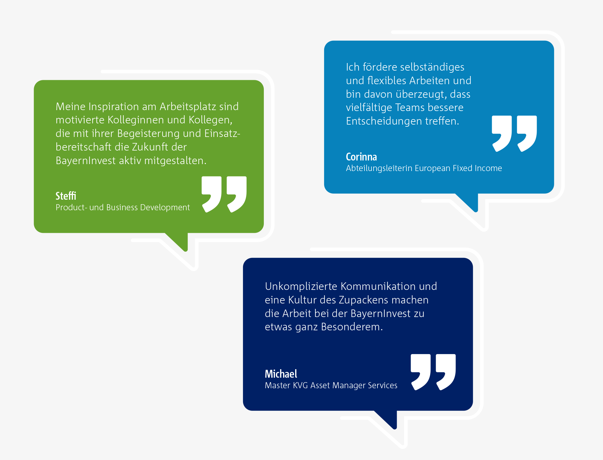 Sie können Ihr Berufs- und Privatleben optimal gestalten und die Arbeitszeit Ihrer individuellen Lebenssituation anpassen. Wir versuchen für unsere Beschäftigten verschiedenste Arbeitszeitmodelle zu realisieren um den Erfordernissen gerecht zu werden. Wir bieten in vielen Bereichen eine große Flexibilität in der Ausgestaltung der Arbeitszeiten an. Unsere Teilzeitquote liegt bei ca. 23 Prozent. Fast alle unserer Beschäftigten arbeiten in einem Gleitzeitrahmen. Die BayernInvest hat zudem eine Betriebsvereinbarung zum Mobilen Arbeiten, die Ihnen ein ortsunabhängiges Arbeiten zwischen Büro und Zuhause ermöglicht. Außerdem haben Sie im Rahmen von Sabbatical, die Möglichkeit eine Auszeit vom Job zu nehmen.